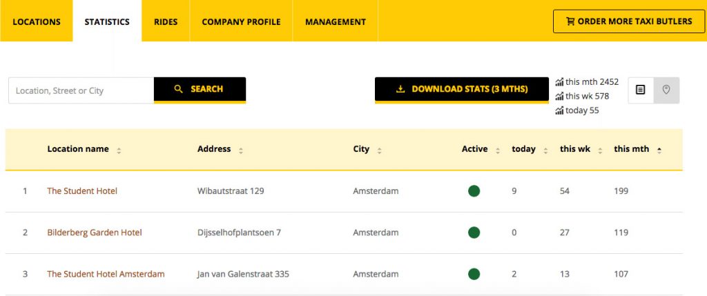 Ihr eigenes Managementportal zeigt Ihnen eine klare und vollständige Übersicht über Ihre Taxi Butler Geräte und detaillierte Informationen über die Fahrzeugbestellungen.